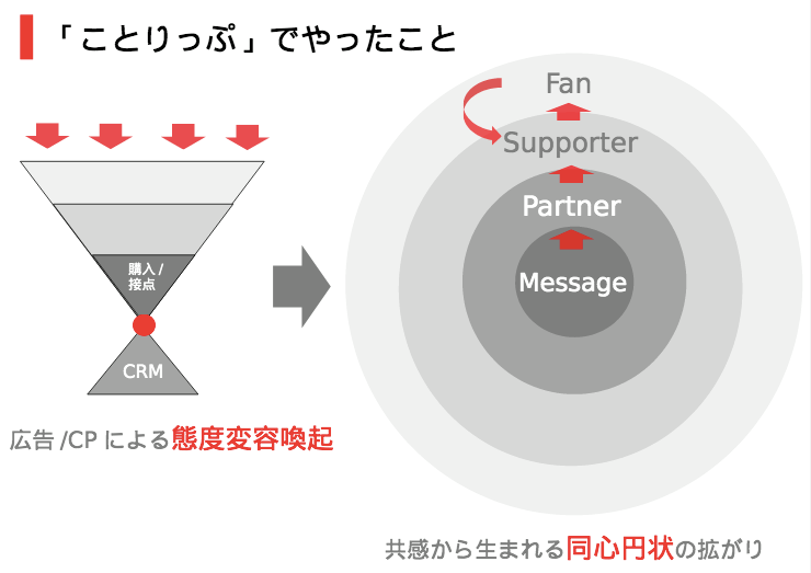 「まず同心円状の中心にコアとなる企業のメッセージを置いて、そのメッセージに共鳴するローカルメディアとパートナシップを結び一緒に活動します。そして活動に共感して一緒に盛り上げてくれるユーザーをサポーターとして発掘し、彼らと一緒に新しいものを作っていく。そしてこれを繰り返す、というシンプルな方法をことりっぷでは実践していました」(平山さん)