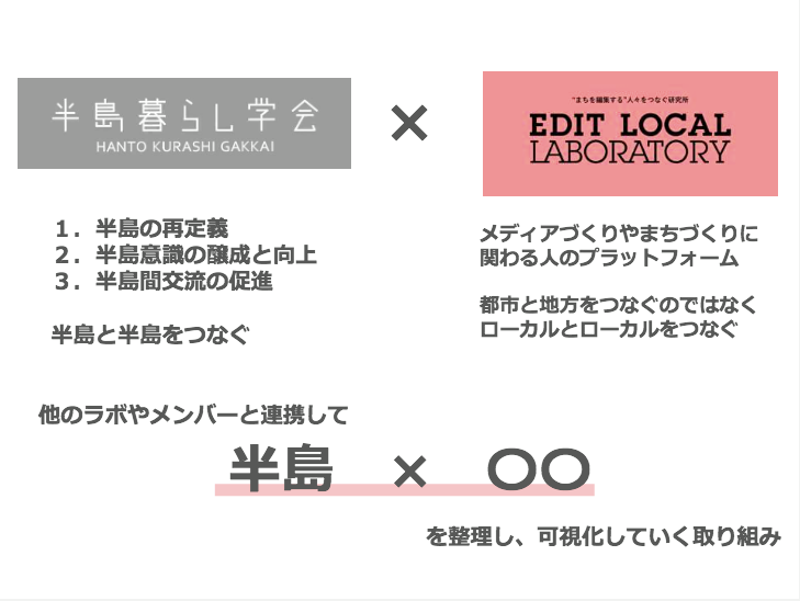 「だからいろんな半島の事例を集めて半島らしさを整理して分析していくのって面白い。そこをつきつめていくのが半島暮らし学会。また、半島ラボに関しては、半島と食とか、半島とアートなどLABORATORYならではのネットワークを活かして盛り上げていきたいですね」(奈良さん)
