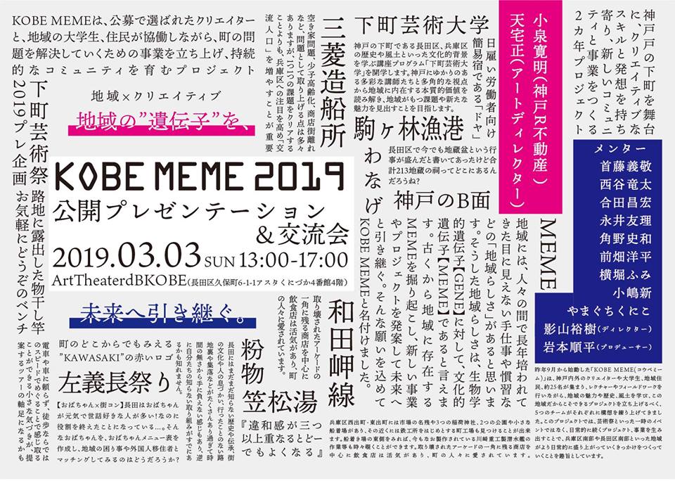 そのうちの一つ、KOBE MEMEの公開プレゼンテーションが3月3日に新長田で開催されます。このプロジェクトは神戸内外の一般参加者が半年以上かけて考えてきたプランを発表する機会です。お近くの方はぜひお越しください。