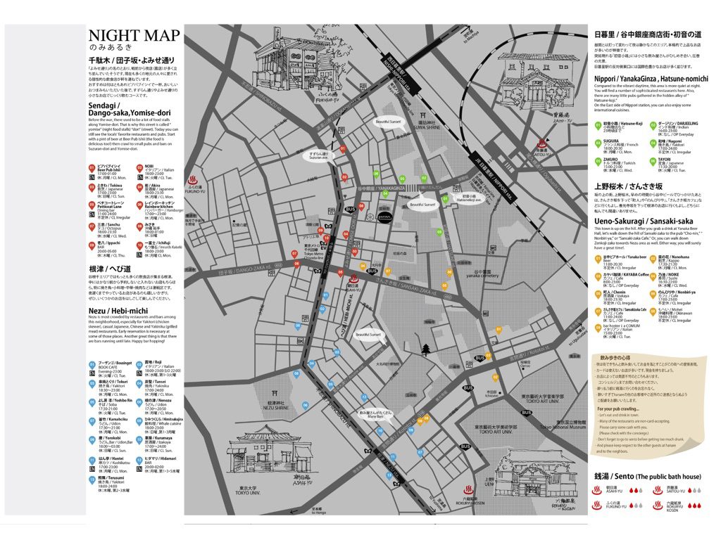 hanareのお客に手渡すオリジナルのマップには裏表があり、表はまち歩き情報、裏は飲み屋情報が載っています。観光地として賑わっている谷中ですが、夕方になると人がいなくなり、飲み屋の出番が少ないという実情をふまえ、飲食店の案内を詳しくしたそうです。