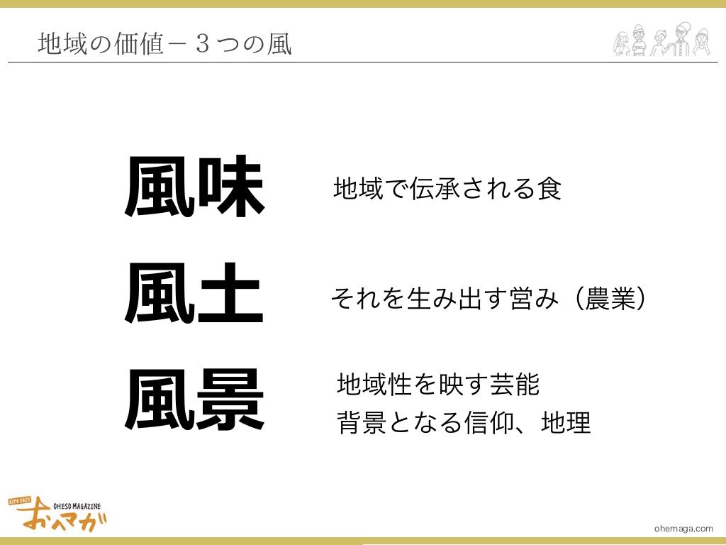 地域の多様な人々と交流を続けるうち、園原さんは地域の価値は、3つの“風”で表現できると感じるようになりました。