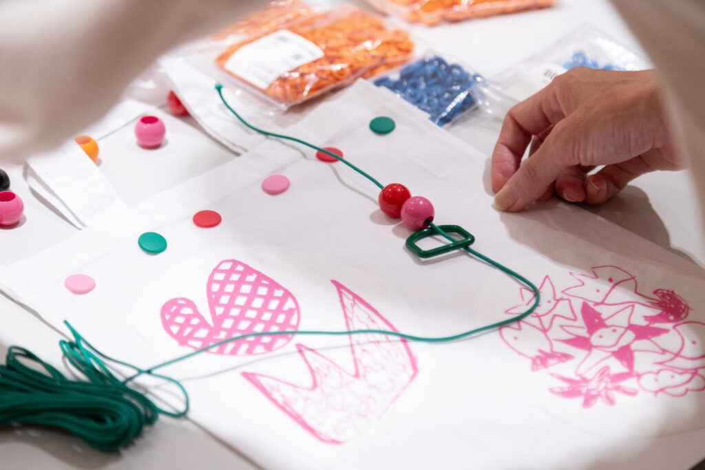 今回のBIOTOPEのワークショップでは、認知症予防に良いとされる「アクティビティ・ブランケット(Activity Blanket)」の制作方法の要素を「遊び」という角度からとりこみ、すべての人が楽しめるアイテムとしてトートバックに上記のような遊戯的装飾を施す実践の機会となった。参加者はBIOTOPEが用意したオリジナルプリントのテキスタイル、カラフルなビーズやファスナー、紐などを自由に配置し、またスナップボタンで留めることで制作後も楽しく変化させることのできるバックの制作を行った。