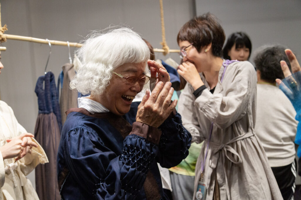 これに対して、居相さんは自ら手間暇をかけて染色・裁断から縫製までした衣服を、コミュニケーションの一貫で「お返し」のつもりで持っていった。すると、思いがけない喜びの表情や仕草に出会った。その美しさに惹かれ、何度も作った衣服を持っていき、それを着た姿を写真に撮ってあげた。すると、それにもまた喜んでくれた。そのうち、洋裁好きなおばあちゃんとがくれた刺し子の生地を居相さんが洋服にするなど、共同作業が生まれるまでになった。