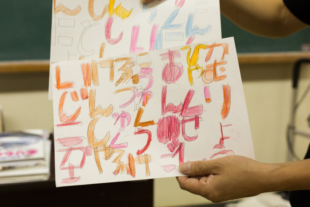 子どもたちはその日に自分が作った作品や、家で作ってきた作品、みんなに見せたいものを胸に抱えて発表の列に並ぶ。一人で行くのが緊張してしまう子や、発表にサポートが必要な人は、スタッフを連れて並ぶ。教室の前方に赤荻さんが立ち、一人ひとりの発表に耳を傾け、作品を掲げて褒め讃える。スタッフも全員が発表者に注目し、耳を傾け、拍手をする。毎回クイズを出す子もいれば、その場で両親への手紙を読み上げる子もいるし、ダンスを踊り出す子もいる。発表したくない子はしなくていい。全員の発表が終わると片づけをし、昼には終了する。月に1回、2時間。毎回がこの繰り返しだ。