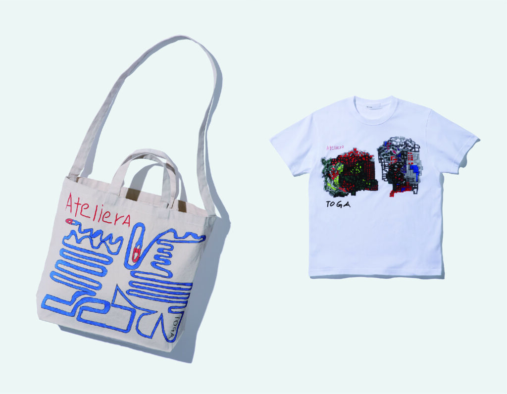 TOGA × atelier Aで発売された商品。(左)トートバッグ プラレール/星野雅和、(右)Tシャツ 通路/土岐健太。