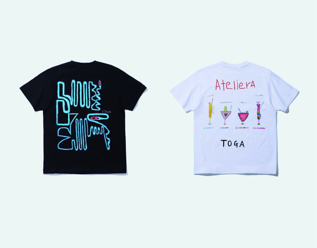 TOGA × atelier Aで発売された商品。(左)Tシャツ プラレール/星野雅和、(右)Tシャツ カクテルシリーズ/稲坂厳。