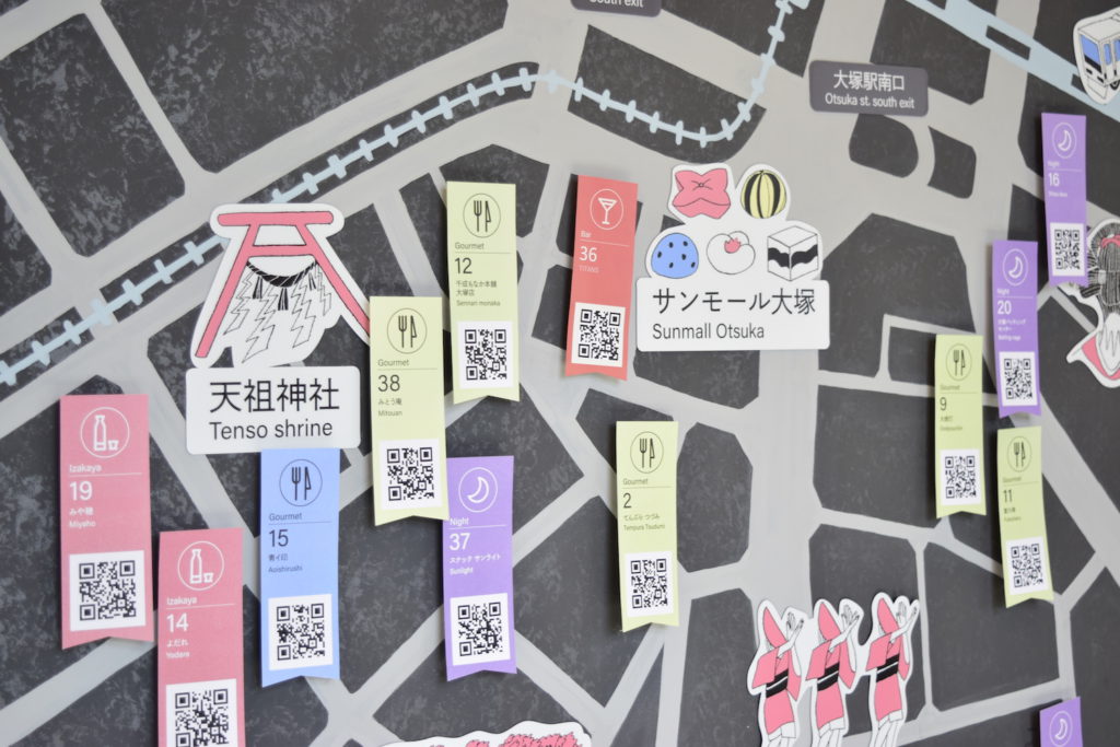 「最初は図書館に行って、このまちの歴史を紐解くことからはじまりました。大塚には何があるんだろう? と、まちの特徴を知ることからリサーチをしていくうちに、『音楽のまちなんだ』『花街の歴史があるんだ』とか、『日本酒の聖地なんだな』とか、色々とわかってきました。そこから、まちの特徴に沿って、4つのエリアにわけてとにかくグルグル歩いて情報を蓄積し、約2ヶ月間で100店舗くらいはまわりましたね」(野部さん)