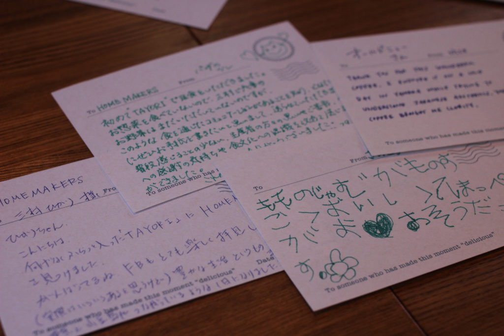 「いろいろあると思うけど、豊かな生活というものを考えさせられて、東京と小豆島がつながっているような一日になりました」という友人からの便りは、この取材の日、TAYORIを訪れたHOMEMAKERSさんに直接手渡された。作り手と食べる人がTAYORIでつながること実感したできごとだった。