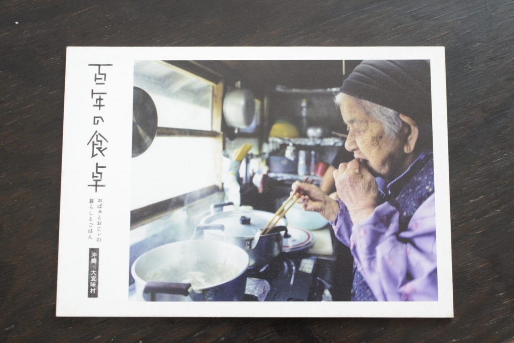 鉛筆で手書きされたようなタイトル文字と、コンロ上で湯気がたちのぼる大きな鍋を前に、ほっかむりをして味見をしているおばあちゃんの写真が表紙を飾る、40ページほどの小さな冊子。『百年の食卓』は、沖縄本島北部の長寿の里として知られる大宜味村で暮らす、明治・大正生まれの10人の「おばぁ」と「おじぃ」のふだんの昼食を取材し、レシピとエピソードをまとめたリトルプレスだ。2013年に制作され、その後は沖縄県内外の高感度な書店や雑貨店、京都のレティシア書房や山口のにちにち、東京の本屋B&Bなどで販売されていた。大宜味村で暮らす、ごくごく普通の「おばぁ」と「おじぃ」と、彼らの食卓の風景を美しい写真とともに紹介した『百年の食卓』は、多くの人の胸を、静かに打った。