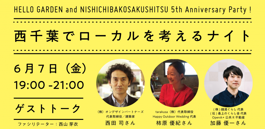 株式会社マイキーが運営する「HELLO GARDEN」と「西千葉工作室」は、この5月で5周年を迎えました。西千葉というローカルなエリアで、今「ローカルで活動すること」をテーマにゲストの方3名を招いて、対談形式でイベントが開催されます。