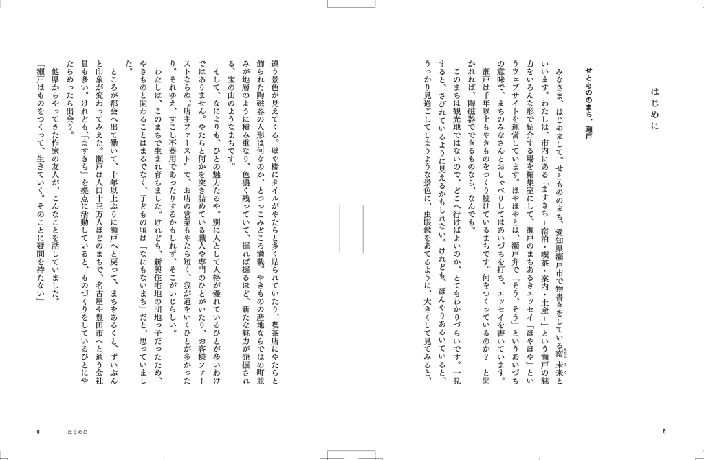 観光地としてはあまり知られていない愛知県瀬戸市ですが、実は千年以上もの間、ずっとやきものを作りつづけている世界的にみても稀有なまち。著者が、生まれ育った「瀬戸」を改めて知ろうと、4年もの歳月をかけてまちを歩き、取材を重ねて完成した一冊をぜひ手に取ってご覧ください。