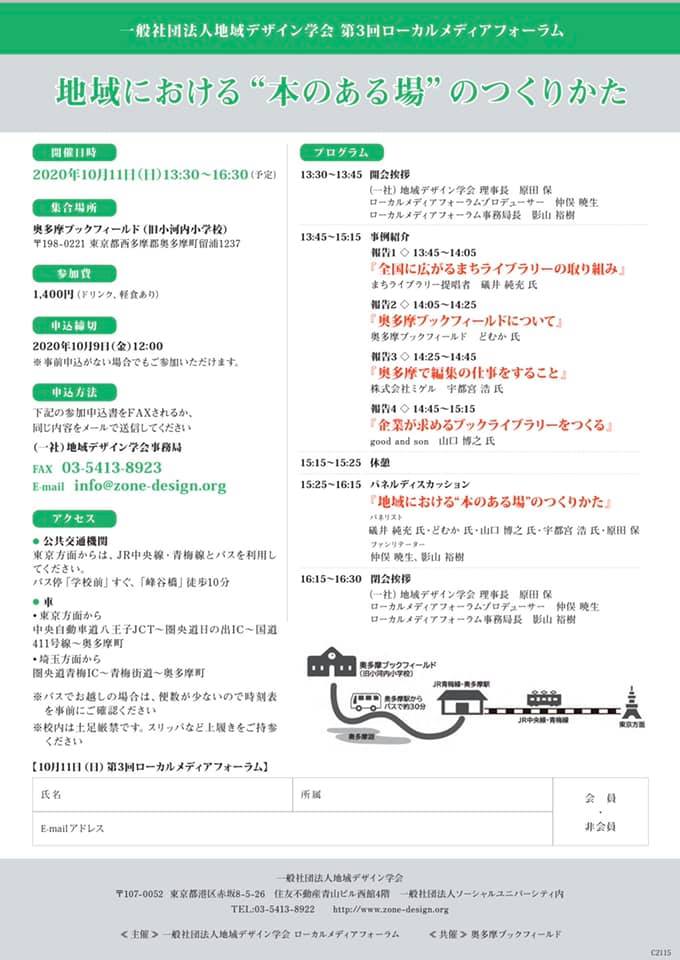一般社団法人地域デザイン学会が主催するローカルメディアフォーラムも3年目を迎えました。東京・奥多摩にあるまちライブラリー「奥多摩ブックフィールド」を舞台に、多彩なゲストをおよびし交流します。ふるってご参加ください。