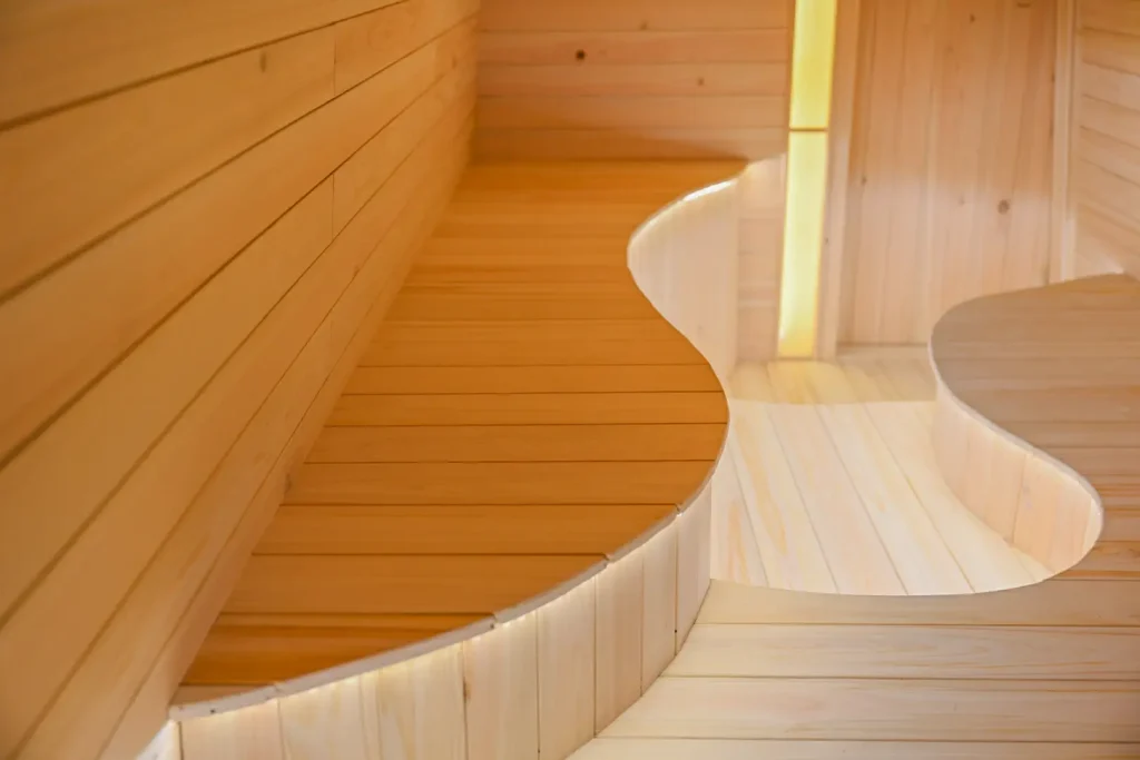 最大6人収容のサウナ室内には、摩周湖の形から着想を得た曲線型のサウナベンチが据えられ、サウナストーンの近くでは100℃を超える熱さを味わえます。ベンチに寝転ぶことで体の芯からじんわり温まる「寝サウナ」も魅力的。
